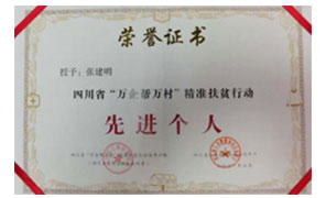 張建明董事長被四川省“萬企幫萬村”精準扶貧行動領導小組、四川省人力資源和社會保障廳授予“四川省‘萬企幫萬村’精準扶貧行動先進個人”榮譽稱號。