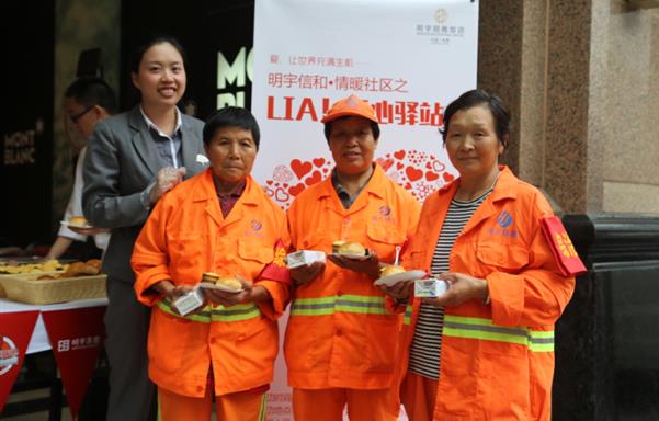 成都明宇麗雅飯店搭起“Lia!愛心驛站”,為區(qū)域內(nèi)出租車司機(jī)、環(huán)衛(wèi)工人、建筑工人等城市建設(shè)者派送愛心食品。